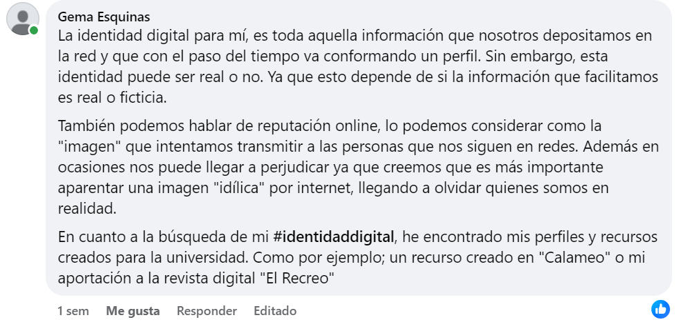 En esta sesión pudimos debatir en pequeños grupos acerca de qué considerábamos que era la "Huella Digital", para que todos pudiésemos conocer la opinión de los demás compañeros lo compartimos en Facebook.